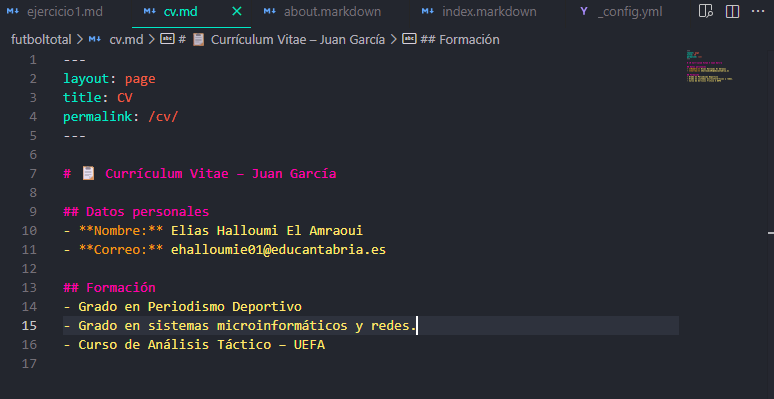 Creamos el fichero cv.md y añadimos contenido.